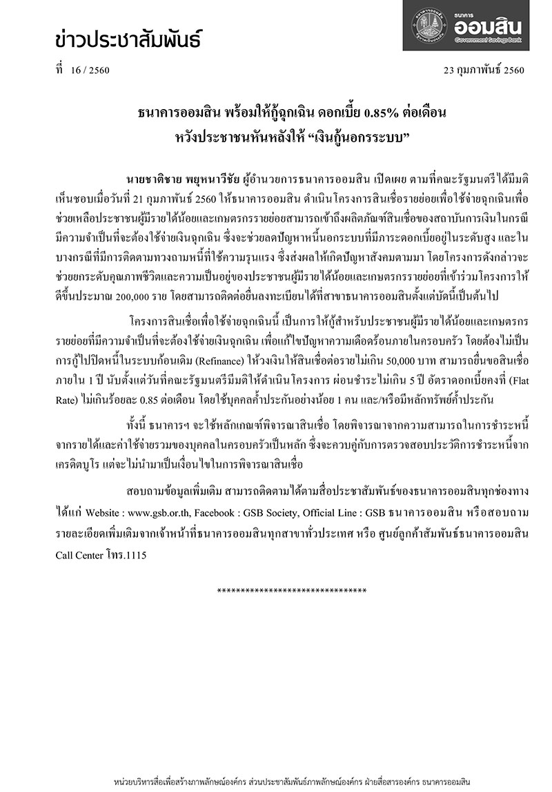 ธนาคารออมสิน พร้อมให้กู้ฉุกเฉิน ดอกเบี้ย 0.85% ต่อเดือน หวังประชาชนหันหลังให้”เงินกู้นอกระบบ”