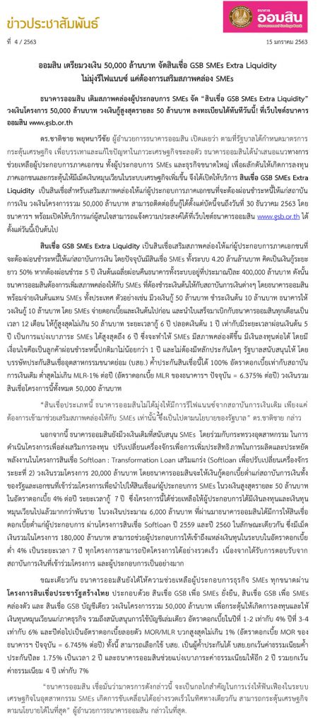 ธนาคารออมสิน เติมสภาพคล่องผู้ประกอบการ SMEs จัด “สินเชื่อ GSB SMEs Extra Liquidity” ลงทะเบียนได้ทันทีวันนี้!
