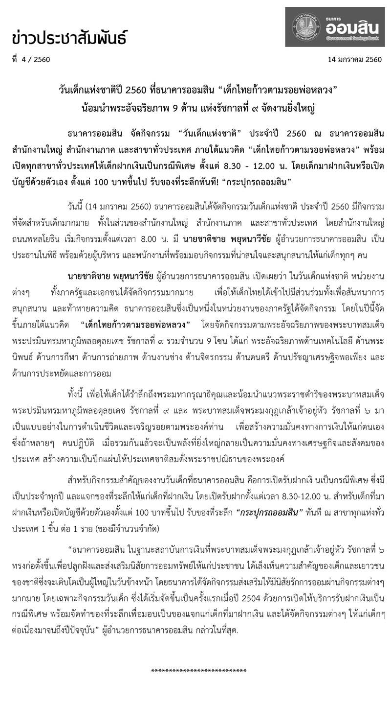 วันเด็กแห่งชาติปี 2560 ที่ธนาคารออมสิน “เด็กไทยก้าวตามรอยพ่อหลวง”น้อมนำพระอัจฉริยภาพ 9 ด้าน แห่งรัชกาลที่ ๙ จัดงานยิ่งใหญ่