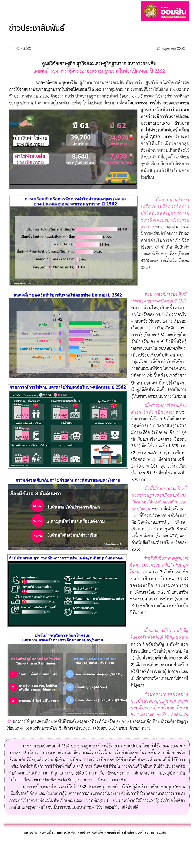 ศูนย์วิจัยเศรษฐกิจ ธุรกิจและเศรษฐกิจฐานราก ธนาคารออมสิน เผยผลสำรวจ การใช้จ่ายของประชาชนฐานรากในช่วงเปิดเทอม ปี 2562