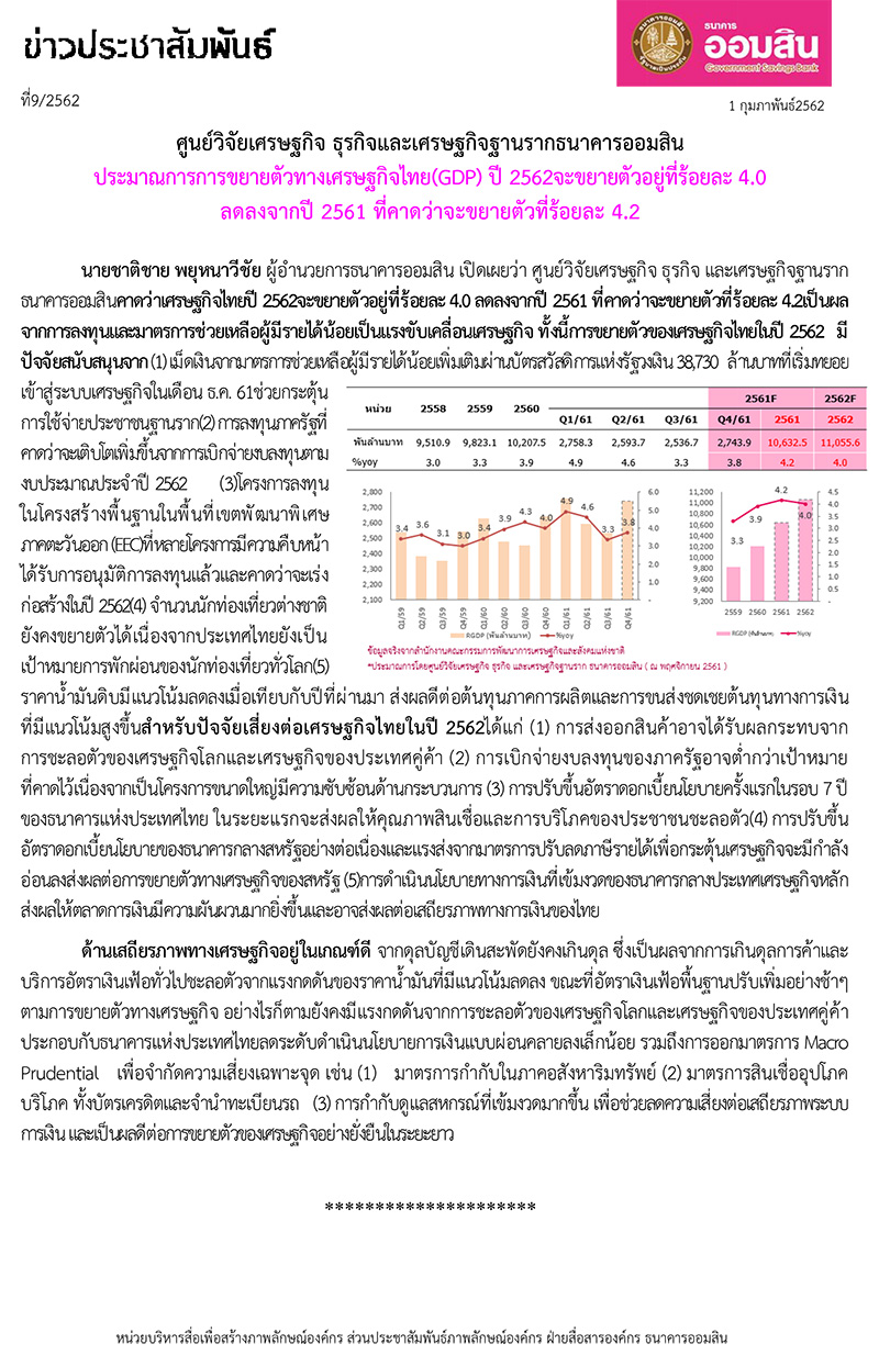 ศูนย์วิจัยเศรษฐกิจ ธุรกิจและเศรษฐกิจฐานรากธนาคารออมสิน ประมาณการการขยายตัวทางเศรษฐกิจไทย(GDP) ปี 2562จะขยายตัวอยู่ที่ร้อยละ 4.0 ลดลงจากปี 2561 ที่คาดว่าจะขยายตัวที่ร้อยละ 4.2