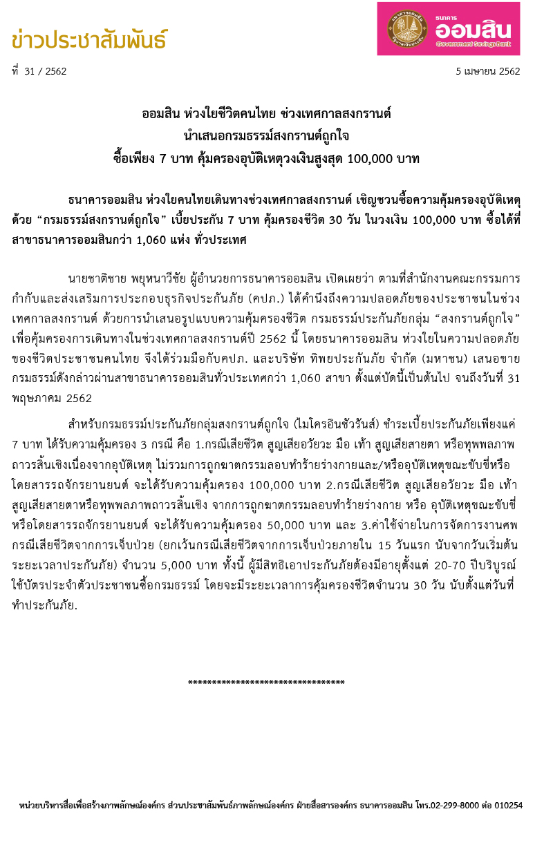 สงกรานต์..ถูกใจ คุ้มครองอุบัติเหตุสูงสุด 100,000 บาท เบี้ยประกันภัย 7 บาท ระยะเวลาคุ้มครอง 30 วัน สำหรับผู้ที่อายุตั้งแต่ 20-70 ปีบริบูรณ์