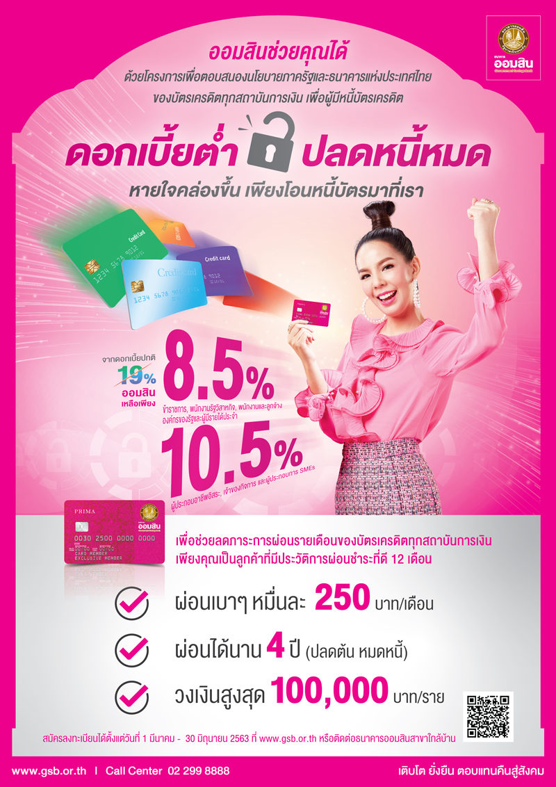 ออมสิน จัดให้!! รีไฟแนนซ์บัตรเครดิตจากสถาบันการเงินอื่น ดอกเบี้ยต่ำ 8.5% ต่อปี ฟรีค่าธรรมเนียมใช้วงเงินบัตร 4 ปี ชำระขั้นต่ำแค่ 2.5% - Government Savings Bank