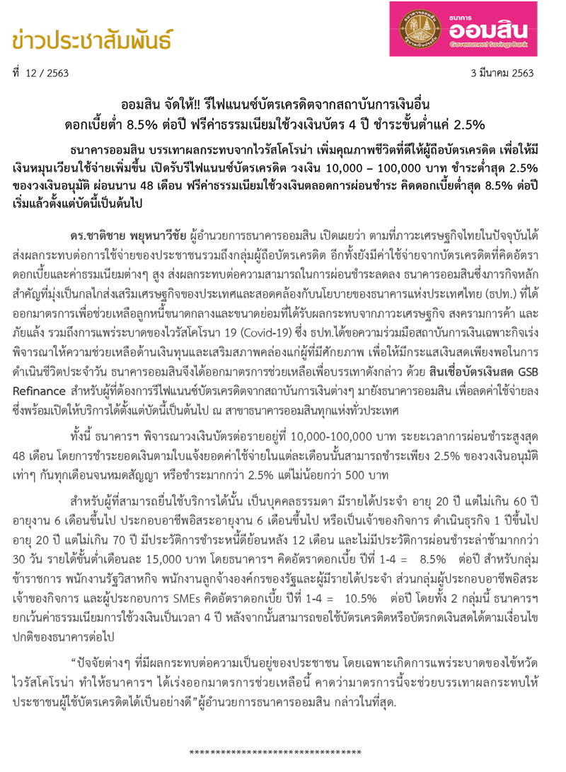 หน้าหลัก > ข่าวสาร > ข่าวประชาสัมพันธ์ > ออมสิน จัดให้!! รีไฟแนนซ์บัตรเครดิตจากสถาบันการเงินอื่น ดอกเบี้ยต่ำ 8.5% ต่อปี ฟรีค่าธรรมเนียมใช้วงเงินบัตร 4 ปี ชำระขั้นต่ำแค่ 2.5%