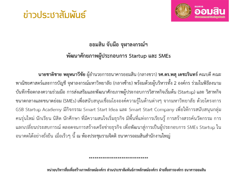 ออมสิน จับมือ จุฬาลงกรณ์ฯ พัฒนาศักยภาพผู้ประกอบการ Startup และ SMEs
