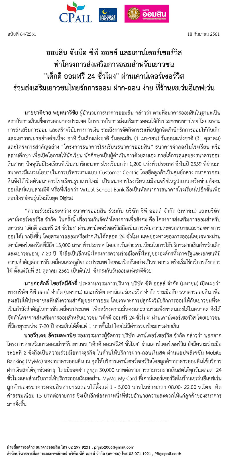 ออมสิน จับมือ ซีพี ออลล์ และเคาน์เตอร์เซอร์วิส ทำโครงการส่งเสริมการออมสำหรับเยาวชน “เด็กดี ออมฟรี 24 ชั่วโมง”