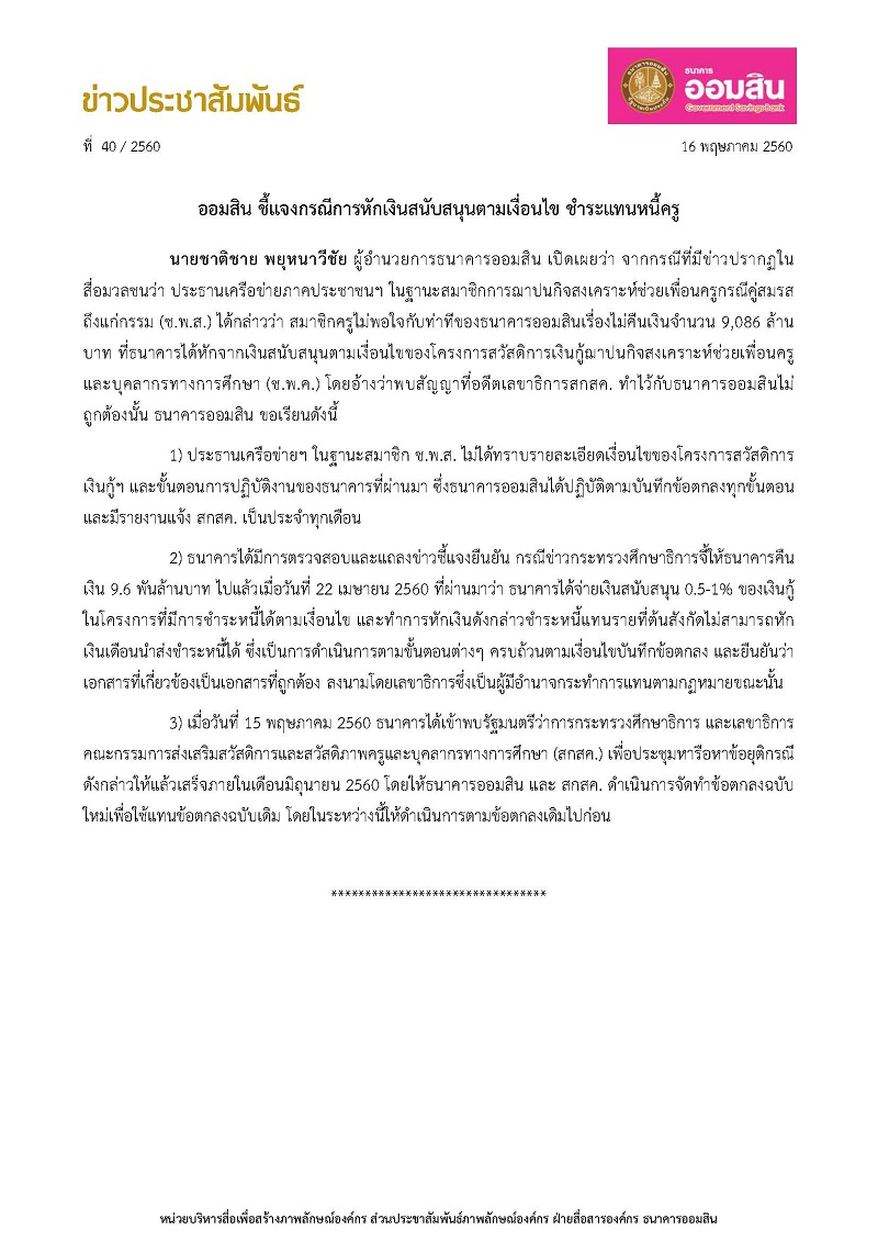 ออมสิน ชี้แจงกรณีการหักเงินสนับสนุนตามเงื่อนไข ชำระแทนหนี้ครู
