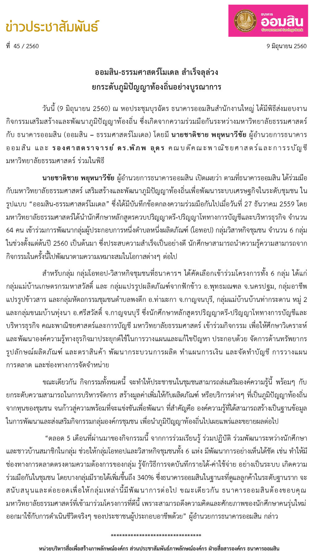 ออมสิน-ธรรมศาสตร์โมเดล สำเร็จลุล่วง ยกระดับภูมิปัญญาท้องถิ่นอย่างบูรณาการ