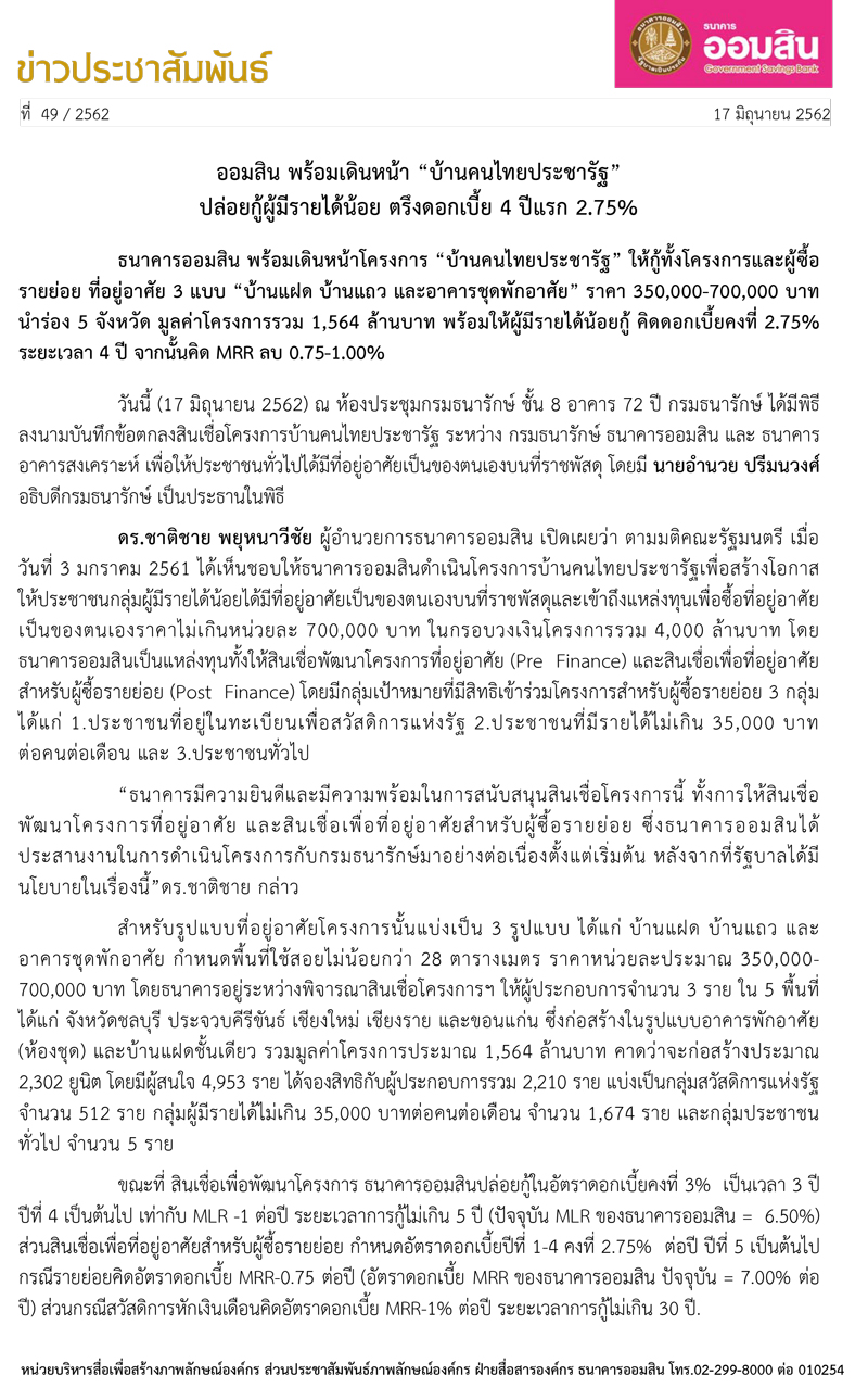 ออมสิน พร้อมเดินหน้า “บ้านคนไทยประชารัฐ” ปล่อยกู้ผู้มีรายได้น้อย ตรึงดอกเบี้ย 4 ปีแรก 2.75% - Government Savings Bank