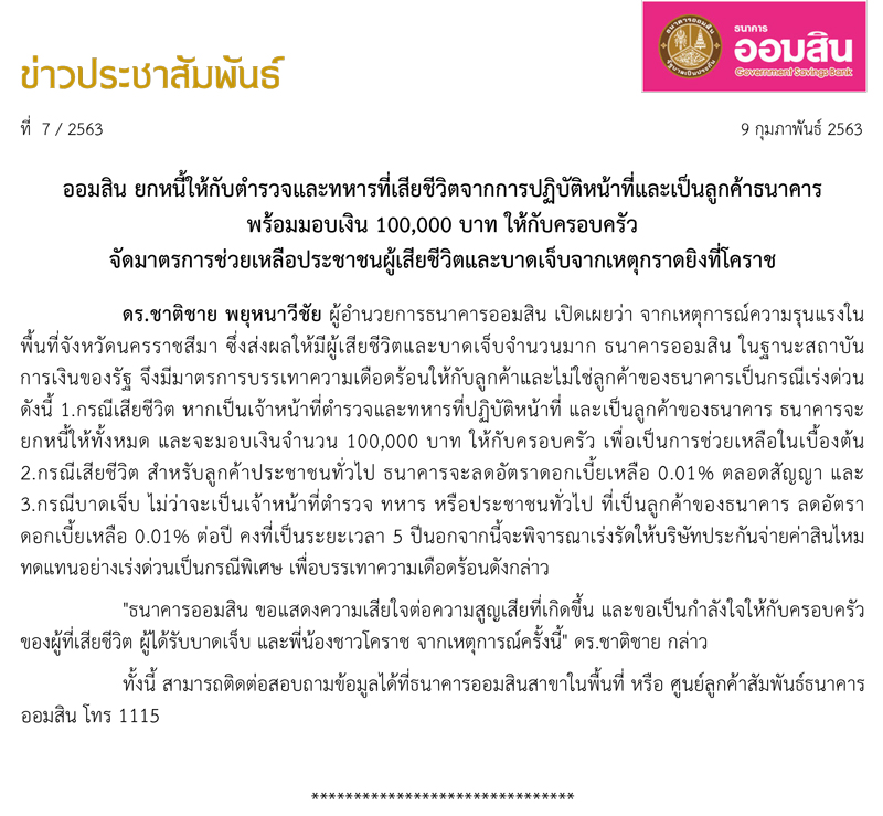 ออมสิน ยกหนี้ให้กับตำรวจและทหารที่เสียชีวิตจากการปฏิบัติหน้าที่และเป็นลูกค้าธนาคาร พร้อมมอบเงิน 100,000 บาท ให้กับครอบครัว จัดมาตรการช่วยเหลือประชาชนผู้เสียชีวิตและบาดเจ็บจากเหตุกราดยิงที่โคราช - Government Savings Bank