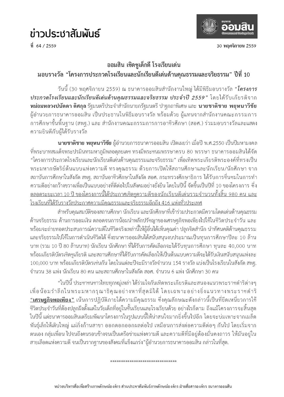 ออมสิน เชิดชูเด็กดี โรงเรียนเด่น มอบรางวัล “โครงการประกวดโรงเรียนและนักเรียนดีเด่นด้านคุณธรรมและจริยธรรม” ปีที่ 10