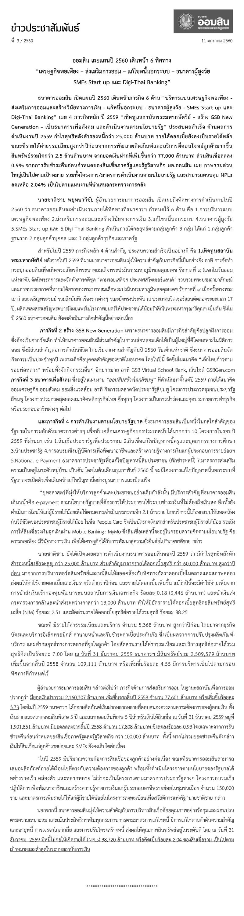 ออมสิน เผยแผนปี 2560 เดินหน้า 6 ทิศทาง “เศรษฐกิจพอเพียง – ส่งเสริมการออม – แก้ไขหนี้นอกระบบ – ธนาคารผู้สูงวัย SMEs Start up และ Digi-Thai Banking”