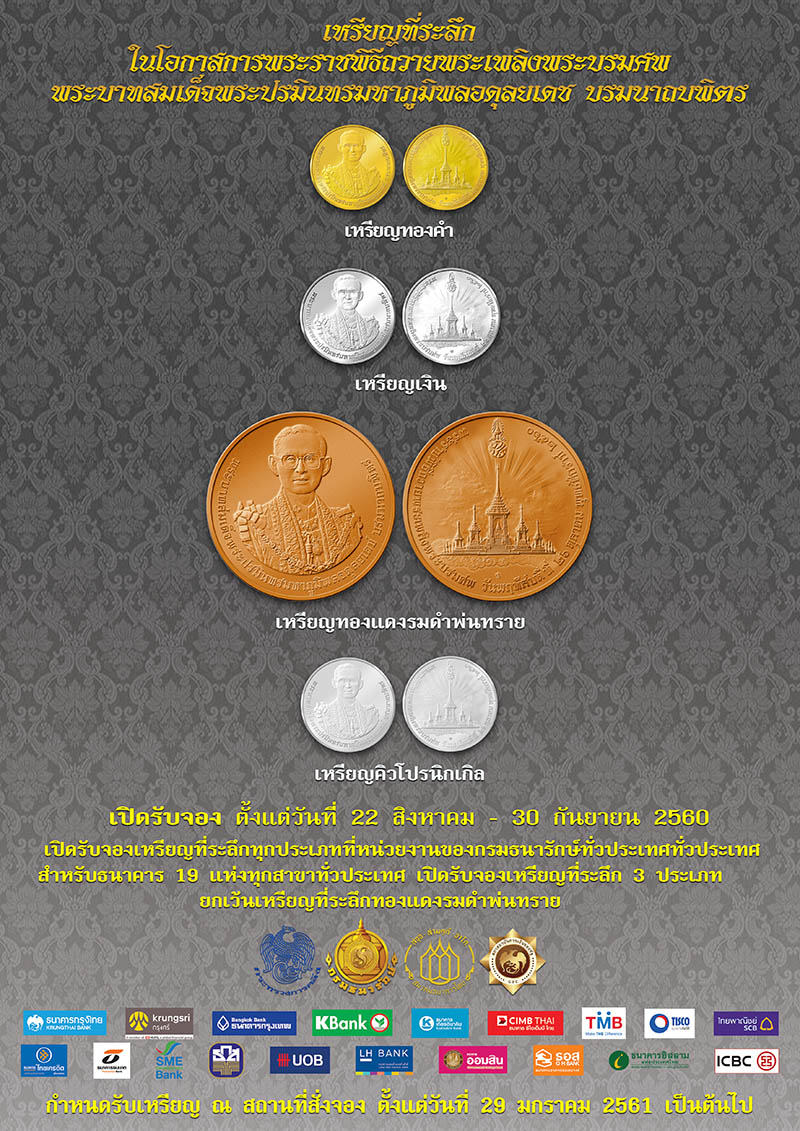 เคาน์เตอร์ธนาคารต่างๆ จานวน 19 แห่ง เปิดรับจองเหรียญที่ระลึก 3 ประเภทยกเว้นเหรียญที่ระลึกทองแดงรมดาพ่นทรายเส้นผ่าศูนย์กลาง 70 มิลลิเมตร น้าหนัก 150 กรัม