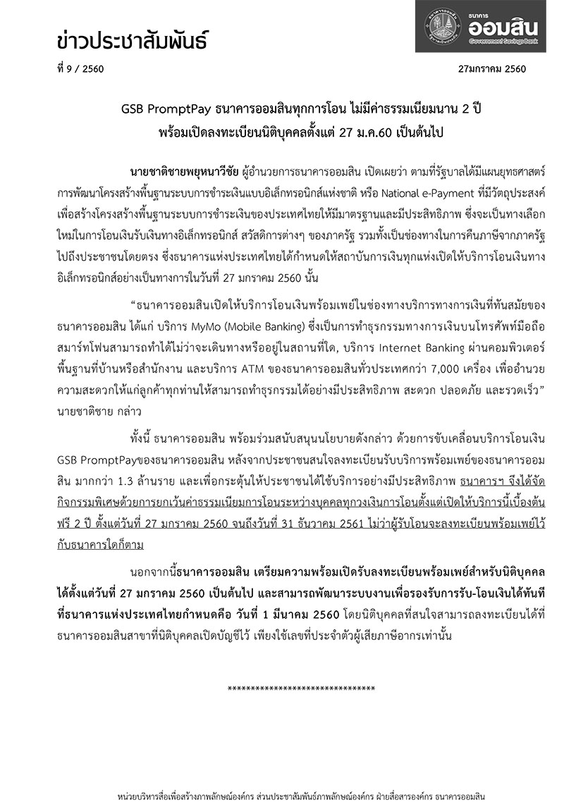 GSB PromptPay ธนาคารออมสินทุกการโอน ไม่มีค่าธรรมเนียมนาน 2 ปี พร้อมเปิดลงทะเบียนนิติบุคคลตั้งแต่ 27 ม.ค.60 เป็นต้นไป