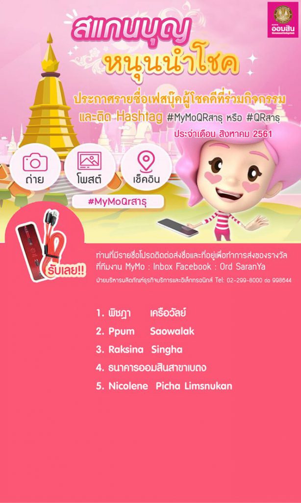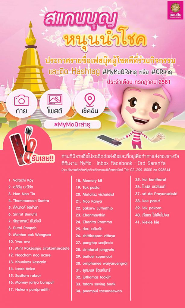 รายชื่อผู้โชคดีกิจกรรม สแกนบุญ หนุนนำโชค ประจำเดือนสิงหาคม