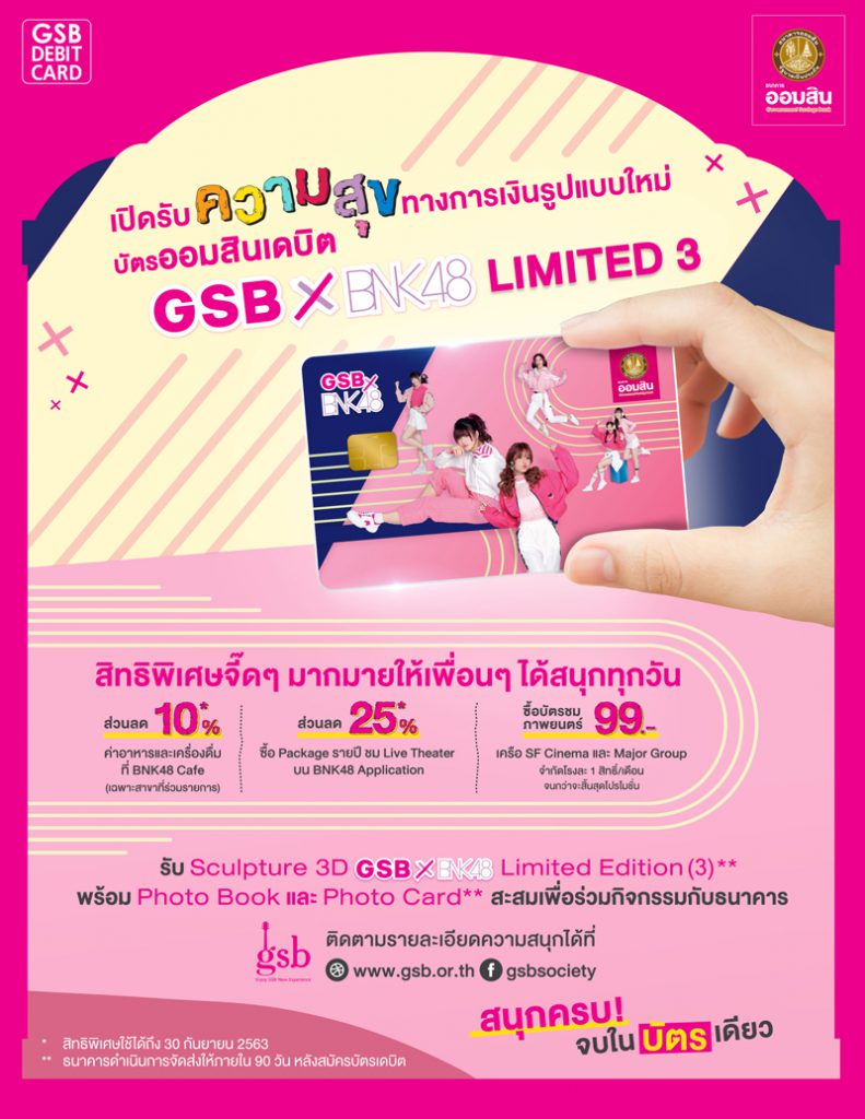 หมายเหตุ : ลูกค้าจะได้รับของพรีเมี่ยมจากการสมัครใช้บัตรออมสินเดบิต GSBxBNK48 Limited ภายใน 90 วันนับถัดจากวันที่สมัครบัตร โดยธนาคารจะจัดส่งให้ตามที่อยู่ปัจจุบันที่ลูกค้าแจ้งไว้กับธนาคารทั้งนี้ ลูกค้าจะได้รับ SMS เมื่อธนาคารทำการจัดส่ง เพื่อติดตามสถานะและติดต่อกรณีมีปัญหาเรื่องของพรีเมี่ยม