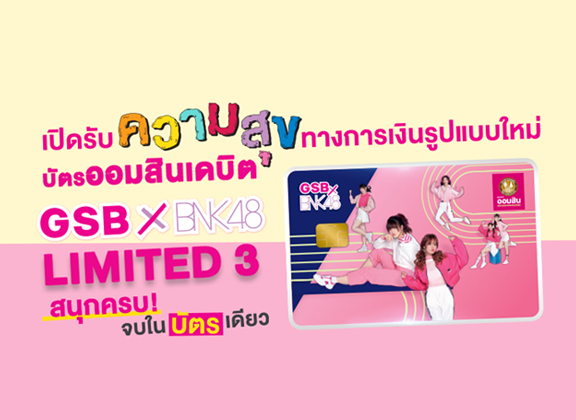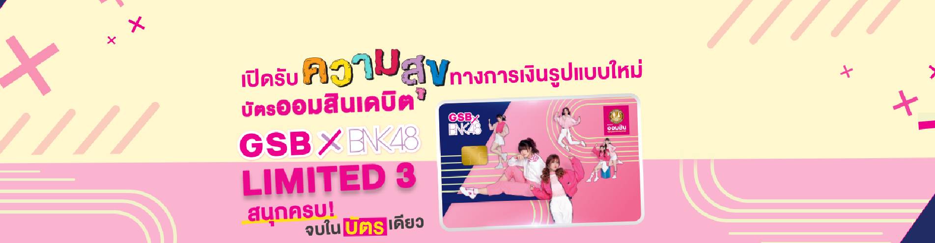 GSB GEN CARD Limited (บัตรออมสิน เดบิต GSBxBNK48 Limited 3) เป็นผลิตภัณฑ์บัตรเดบิตที่ทำให้ชีวิตของคุณสะดวกสบายยิ่งขึ้นกับการใช้จ่ายผ่านบัตร สามารถรูดซื้อสินค้า ถอนเงิน โอนเงิน ชำระสินค้า บริการและใช้ฝากเงินสดเข้าบัญชีผู้ถือบัตรได้